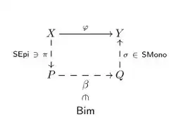 More generally, suppose a category is linearly complete,[6] well-powered in strong monomorphisms,[7] co-well-powered in strong epimorphisms,[8] and in addition strong epimorphisms discern monomorphisms[10] in , and, dually, strong monomorphisms discern epimorphisms[11] in , then has nodal decomposition.[12]