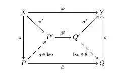 - ↑ An epimorphism is said to be strong, if for any monomorphism and for any morphisms and such that there exists a morphism , such that and .