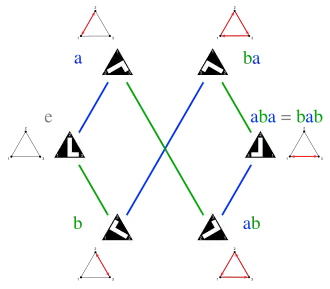 In multiplicative form, we traditionally write xy for the combined action "first do y, then do x"; so that ab is the action RGB ↦ RBG ↦ BRG, i.e., "take the last block and move it to the front". If we write e for "leave the blocks as they are" (the identity action), then we can write the six permutations of the set of three blocks as the following actions: