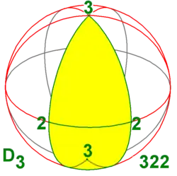 - one with a 3-fold rotation axis and a perpendicular 2-fold rotation axis (hence three of these): D3