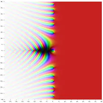 Riemann zeta function ζ(s) in the complex plane. The color of a point s gives the value of ζ(s): dark colors denote values close to zero and hue gives the value's argument.