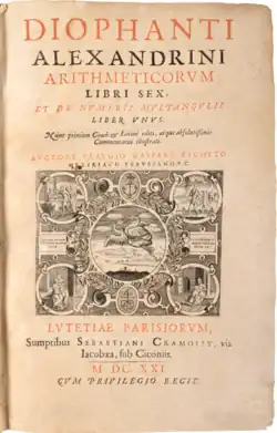 Title page of Diophantus's Arithmetica, translated into Latin by Bachet (1621)