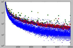 In 2009, the OEIS database was used by Philippe Guglielmetti to measure the "importance" of each integer number.[25] The result shown in the plot on the right shows a clear "gap" between two distinct point clouds,[26] the "uninteresting numbers" (blue dots) and the "interesting" numbers that occur comparatively more often in sequences from the OEIS. It contains essentially prime numbers (red), numbers of the form an (green) and highly composite numbers (yellow). This phenomenon was studied by Nicolas Gauvrit, Jean-Paul Delahaye and Hector Zenil who explained the speed of the two clouds in terms of algorithmic complexity and the gap by social factors based on an artificial preference for sequences of primes, even numbers, geometric and Fibonacci-type sequences and so on.[27] Sloane's gap was featured on a Numberphile video in 2013.[28]