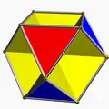 It shares the vertex arrangement and edge arrangement with the cuboctahedron (having the triangular faces in common), and with the cubohemioctahedron (having the hexagonal faces in common).