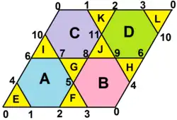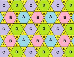 The topological net of faces can be arranged as a rhombus divided into 8 triangles and 4 hexagons. All vertex angle defects are zero.