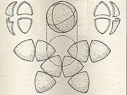 The octant projection is the first known polyhedral map projection. It is neither conformal nor equal-area.[8] In it, the spherical surface of the earth is divided into eight octants, each flattened into the shape of a Reuleaux triangle bound by circular arcs. If transferred to an elastic support, it would be possible to cover with them the surface of a model of the earth's globe.[9][10]