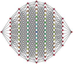 ![]() This 8-cube graph is an orthogonal projection. This orientation shows columns of vertices positioned a vertex-edge-vertex distance from one vertex on the left to one vertex on the right, and edges attaching adjacent columns of vertices. The number of vertices in each column represents rows in Pascal's triangle, being 1:8:28:56:70:56:28:8:1. |