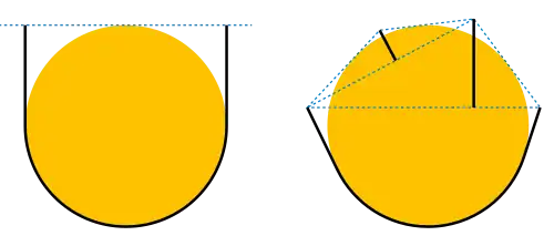 If is a bounded convex set to be covered, then its boundary forms an opaque set whose length is the perimeter . Therefore, the shortest possible length of an opaque set is at most the perimeter. For sets that are strictly convex, meaning that there are no line segments on the boundary, and for interior barriers, this bound is tight. Every point on the boundary must be contained in the opaque set, because every boundary point has a tangent line through it that cannot be blocked by any other points.[5] The same reasoning shows that for interior barriers of convex polygons, all vertices must be included. Therefore, the minimum Steiner tree of the vertices is the shortest connected opaque set, and the traveling salesperson path of the vertices is the shortest single-curve opaque set.[4] However, for interior barriers of non-polygonal convex sets that are not strictly convex, or for barriers that are not required to be connected, other opaque sets may be shorter; for instance, it is always possible to omit the longest line segment of the boundary. In these cases, the perimeter or Steiner tree length provide an upper bound on the length of an opaque set.[3][4]