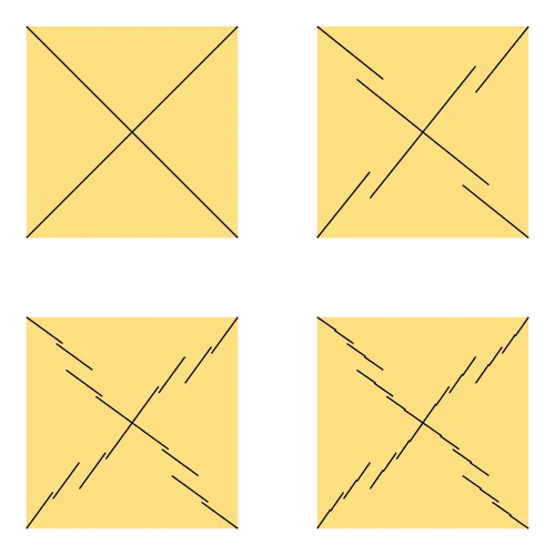 Mazurkiewicz (1916) showed that it is possible for an opaque set to avoid containing any nontrivial curves and still have finite total length.[1] A simplified construction of Bagemihl (1959), shown in the figure, produces an example for the unit square. The construction begins with line segments that form an opaque set with an additional property: the segments of negative slope block all lines of non-negative slope, while the segments of positive slope block all lines of non-positive slope. In the figure, the initial segments with this property are four disjoint segments along the diagonals of the square. Then, it repeatedly subdivides these segments while maintaining this property. At each level of the construction, each line segment is split by a small gap near its midpoint into two line segments, with slope of the same sign, that together block all lines of the opposite sign that were blocked by the original line segment. The limit set of this construction is a Cantor space that, like all intermediate stages of the construction, is an opaque set for the square. With quickly decreasing gap sizes, the construction produces a set whose Hausdorff dimension is one, and whose one-dimensional Hausdorff measure (a notion of length suitable for such sets) is finite.[2]