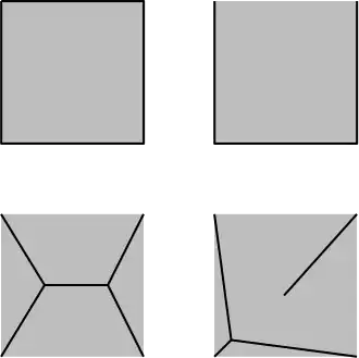 Four opaque sets for a unit square. Upper left: its boundary, length 4. Upper right: Three sides, length 3. Lower left: a Steiner tree of the vertices, length . Lower right: the conjectured optimal solution, length .