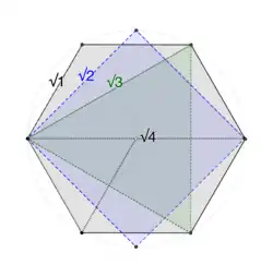 To visualize how the interior polytopes of the 24-cell fit together (as described below), keep in mind that the four chord lengths (√1, √2, √3, √4) are the long diameters of the hypercubes of dimensions 1 through 4: the long diameter of the square is √2; the long diameter of the cube is √3; and the long diameter of the tesseract is √4.[ac] Moreover, the long diameter of the octahedron is √2 like the square; and the long diameter of the 24-cell itself is √4 like the tesseract.