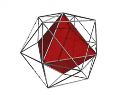 The 24-cell does not have a regular analogue in three dimensions or any other number of dimensions, either below or above.[4] It is the only one of the six convex regular 4-polytopes which is not the analogue of one of the five Platonic solids. However, it can be seen as the analogue of a pair of irregular solids: the cuboctahedron and its dual the rhombic dodecahedron.[5]