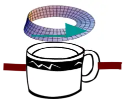 In this situation, a spinor is a sort of polarized vector. In the adjacent diagram, a spinor can be represented as a vector whose head is a flag lying on one side of a Möbius strip, pointing inward. Initially, suppose that the flag is on top of the strip as shown. As the coffee cup is rotated it carries the spinor, and its flag, along the strip. If the cup is rotated through 360°, the spinor returns to the initial position, but the flag is now underneath the strip, pointing outward. It takes another 360° rotation in order to return the flag to its original orientation.