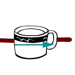 In fact, the coffee cup is inextricably entangled. There is no way to untwist the bands without rotating the cup. However, consider what happens instead when the cup is rotated, not through just one 360° turn, but two 360° turns for a total rotation of 720°. Then if the cup is lowered to the floor, the two rubber bands coil around each other in two full twists of a double helix. If the cup is now brought up through the center of one coil of this helix, and passed onto its other side, the twist disappears. The bands are no longer coiled about each other, even though no additional rotation had to be performed. (This experiment is more easily performed with a ribbon or belt. See below.)