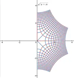 A simple method for generating orthogonal coordinates systems in two dimensions is by a conformal mapping of a standard two-dimensional grid of Cartesian coordinates (x, y). A complex number z = x + iy can be formed from the real coordinates x and y, where i represents the imaginary unit. Any holomorphic function w = f(z) with non-zero complex derivative will produce a conformal mapping; if the resulting complex number is written w = u + iv, then the curves of constant u and v intersect at right angles, just as the original lines of constant x and y did.