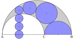 The height hn of the center of the nth circle above the base diameter ACB equals n times dn.[1] This may be shown by inverting in a circle centered on the tangent point A. The circle of inversion is chosen to intersect the nth circle perpendicularly, so that the nth circle is transformed into itself. The two arbelos circles, CU and CV, are transformed into parallel lines tangent to and sandwiching the nth circle; hence, the other circles of the Pappus chain are transformed into similarly sandwiched circles of the same diameter. The initial circle C0 and the final circle Cn each contribute 1/2dn to the height hn, whereas the circles C1 to Cn−1 each contribute dn. Adding these contributions together yields the equation hn = ndn.