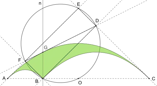 The four tangents at the three cusps of the parabola intersect in four points, which form a rectangle being called the tangent rectangle. The circumcircle of the tangent rectangle intersects the base side of the outer parabola segment in its midpoint, which is the focus of the outer parabola. One diagonal of the tangent rectangle lies on a tangent to the outer parabola and its common point with it is identical to its point of intersection with perpendicular to the base at the inner cusp. For the area of the tangent rectangle the following equation holds:[2]