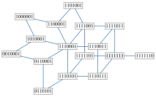 - Consider the graph whose vertex labels consist of all possible (2n + 1)-digit bitstrings that have either n or n + 1 nonzero bits, where two vertices are adjacent whenever their labels differ by a single bit. This labeling defines an embedding of these graphs into a hypercube (the graph of all bitstrings of a given length, with the same adjacency-condition) that turns out to be distance-preserving. The resulting graph is a bipartite Kneser graph; the graph formed in this way with n = 2 has 20 vertices and 30 edges, and is called the Desargues graph.