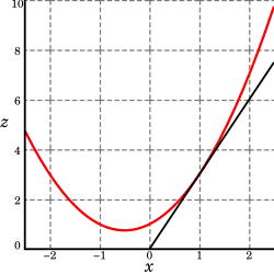 To find the slope of the line tangent to the function at P(1, 1) and parallel to the xz-plane, we treat y as a constant. The graph and this plane are shown on the right. Below, we see how the function looks on the plane y = 1. By finding the derivative of the equation while assuming that y is a constant, we find that the slope of f at the point (x, y) is: