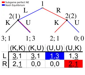 Both extensive and normal-form illustration of a sequential game with subgame imperfect and perfect Nash equilibria marked with red and blue respectively.