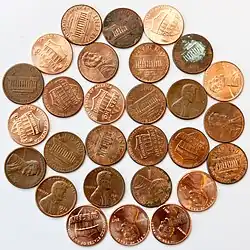 In geometric graph theory, a penny graph is a contact graph of unit circles. It is formed from a collection of unit circles that do not cross each other, by creating a vertex for each circle and an edge for every pair of tangent circles.[1] The circles can be represented physically by pennies, arranged without overlapping on a flat surface, with a vertex for each penny and an edge for each two pennies that touch.