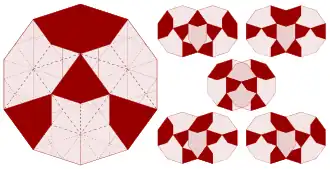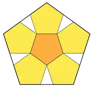 Penrose originally discovered the P1 tiling in this way, by decomposing a pentagon into six smaller pentagons (one half of a net of a dodecahedron) and five half-diamonds; he then observed that when he repeated this process the gaps between pentagons could all be filled by stars, diamonds, boats and other pentagons.[30] By iterating this process indefinitely he obtained one of the two P1 tilings with pentagonal symmetry.[11][22]