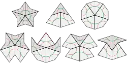 These rules often force the placement of certain tiles: for example, the concave vertex of any dart is necessarily filled by two kites. The corresponding figure (center of the top row in the lower image on the left) is called an "ace" by Conway; although it looks like an enlarged kite, it does not tile in the same way.[35] Similarly the concave vertex formed when two kites meet along a short edge is necessarily filled by two darts (bottom right). In fact, there are only seven possible ways for the tiles to meet at a vertex; two of these figures – namely, the "star" (top left) and the "sun" (top right) – have 5-fold dihedral symmetry (by rotations and reflections), while the remainder have a single axis of reflection (vertical in the image).[36] Apart from the ace (top middle) and the sun, all of these vertex figures force the placement of additional tiles.[37]