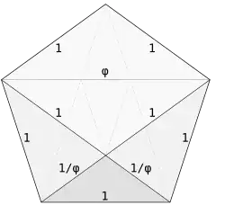 Several properties and common features of the Penrose tilings involve the golden ratio (approximately 1.618).[33][34] This is the ratio of chord lengths to side lengths in a regular pentagon, and satisfies φ = 1 + 1/φ.