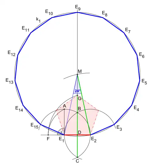 Compare the construction according to Euclid in this image: Pentadecagon