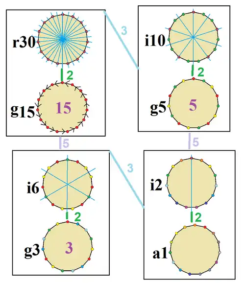 On the pentadecagon, there are 8 distinct symmetries. John Conway labels these symmetries with a letter and order of the symmetry follows the letter.[3] He gives r30 for the full reflective symmetry, Dih15. He gives d (diagonal) with reflection lines through vertices, p with reflection lines through edges (perpendicular), and for the odd-sided pentadecagon i with mirror lines through both vertices and edges, and g for cyclic symmetry. a1 labels no symmetry.