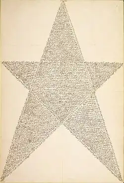The five-pointed star is a symbol of the Baháʼí Faith.[38][39] In the Baháʼí Faith, the star is known as the Haykal (Arabic: "temple"), and it was initiated and established by the Báb. The Báb and Bahá'u'lláh wrote various works in the form of a pentagram.[40][41]