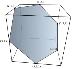 The alternative spelling permutahedron is sometimes also used.[2] Permutohedra are sometimes called permutation polytopes, but this terminology is also used for the related Birkhoff polytope, defined as the convex hull of permutation matrices. More generally, V. Joseph Bowman (1972) uses that term for any polytope whose vertices have a bijection with the permutations of some set.
