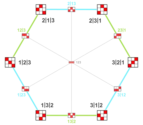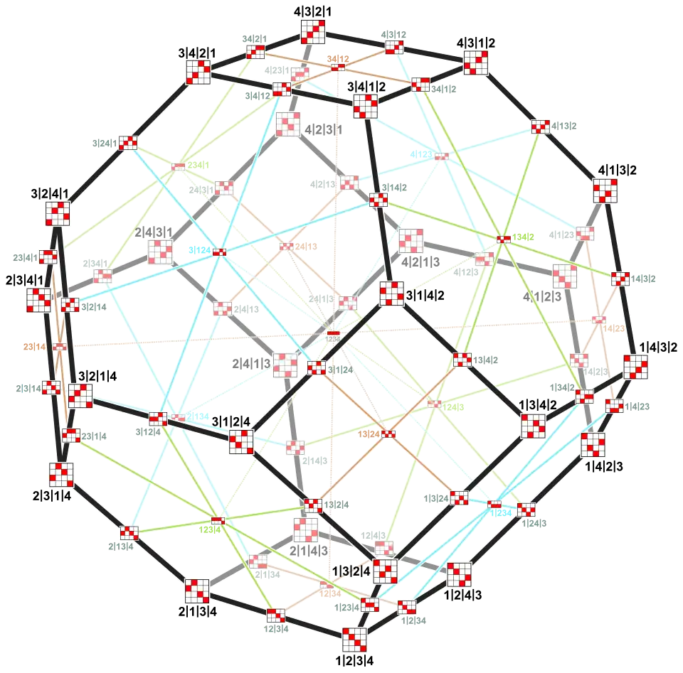 The images above show the face lattices of the permutohedra of order 3 and 4 (without the empty faces). The vertex labels a | b | c | d interpreted as permutations (a, b, c, d) are those forming the Cayley graph.