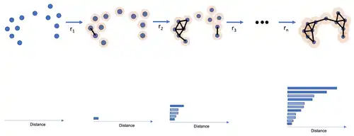 In topological data analysis, a persistence barcode, sometimes shortened to barcode, is an algebraic invariant associated with a filtered chain complex or a persistence module that characterizes the stability of topological features throughout a growing family of spaces.[1] Formally, a persistence barcode consists of a multiset of intervals in the extended real line, where the length of each interval corresponds to the lifetime of a topological feature in a filtration, usually built on a point cloud, a graph, a function, or, more generally, a simplicial complex or a chain complex. Generally, longer intervals in a barcode correspond to more robust features, whereas shorter intervals are more likely to be noise in the data. A persistence barcode is a complete invariant that captures all the topological information in a filtration.[2] In algebraic topology, the persistence barcodes were first introduced by Sergey Barannikov in 1994 as the "canonical forms" invariants[2] consisting of a multiset of line segments with ends on two parallel lines, and later, in geometry processing, by Gunnar Carlsson et al. in 2004.[3]