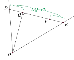 In geometry, the Philo line is a line segment defined from an angle and a point inside the angle as the shortest line segment through the point that has its endpoints on the two sides of the angle. Also known as the Philon line, it is named after Philo of Byzantium, a Greek writer on mechanical devices, who lived probably during the 1st or 2nd century BC. Philo used the line to double the cube;[1][2] because doubling the cube cannot be done by a straightedge and compass construction, neither can constructing the Philo line.[1][3]