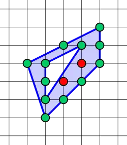 - 1 2 Beck, Matthias; Robins, Sinai (2015). "2.6 Pick's theorem". Computing the Continuous Discretely: Integer-Point Enumeration in Polyhedra. Undergraduate Texts in Mathematics (2nd ed.). Springer. pp. 40–43. doi:10.1007/978-1-4939-2969-6. ISBN 978-1-4939-2968-9. MR 3410115.