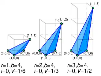 The Reeve tetrahedra in three dimensions have four integer points as vertices and contain no other integer points, but do not all have the same volume. Therefore, there does not exist an analogue of Pick's theorem in three dimensions that expresses the volume of a polyhedron as a function only of its numbers of interior and boundary points.[20] However, these volumes can instead be expressed using Ehrhart polynomials.[21][22]