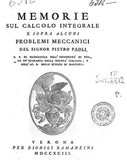 Paoli worked mainly in calculus and his applications to optics and mechanics. In spite of his duties, there are only two works on hydraulics.[3] His main work was Elementi di Algebra in two volumes (1794) which was widely distributed in Italy for many years.[4]