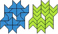 The Compatibility Problem is to take two or more polyaboloes and find a figure that can be tiled with each. This problem has been studied far less than the Compatibility Problem for polyominoes. Systematic results first appeared in 2004 on Erich Friedman's website Math Magic.[4]
