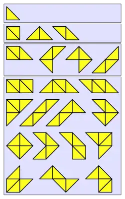 In recreational mathematics, a polyabolo (also known as a polytan or polytrong) is a shape formed by gluing isosceles right triangles edge-to-edge, making a polyform with the isosceles right triangle as the base form. Polyaboloes were introduced by Martin Gardner in his June 1967 "Mathematical Games column" in Scientific American.[1]