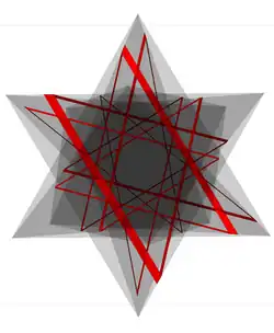 | The nonconvex great icosahedron, {3,5/2} has a density of 7 as demonstrated in this transparent and cross-sectional view on the right. | |