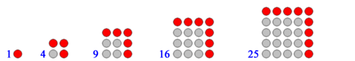 1 | 4 | 9 | 16 | 25 | 36 | 49 | 64 | 81 | 100 | π2/6[3] | A000290 |