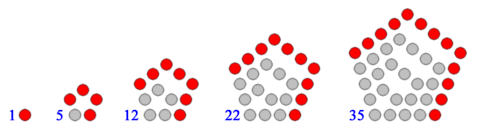 | 5 | Pentagonal | 1/2(3n2 − n) | 1 | 5 | 12 | 22 | 35 | 51 | 70 | 92 | 117 | 145 | 3 ln 3 − π√3/3[3] | A000326 |