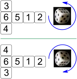 Opposite sides of a modern die traditionally add up to seven, requiring the 1, 2, and 3 faces to share a vertex.[18] The faces of a die may be placed clockwise or counterclockwise about this vertex. If the 1, 2, and 3 faces run counterclockwise, the die is called "right-handed". If those faces run clockwise, the die is called "left-handed". Western dice are normally right-handed, and Chinese dice are normally left-handed.[19]
