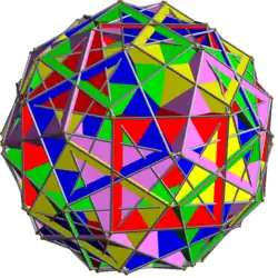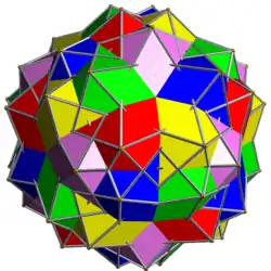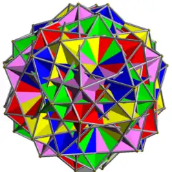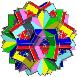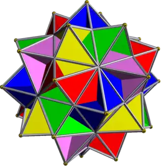 In 4-dimensions, there are a large number of regular compounds of regular polytopes. Coxeter lists a few of these in his book Regular Polytopes.[4] McMullen added six in his paper New Regular Compounds of 4-Polytopes.[5]