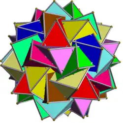 The regular compound of five tetrahedra comes in two enantiomorphic versions, which together make up the regular compound of ten tetrahedra.[1] The regular compound of ten tetrahedra can also be seen as a compound of five stellae octangulae.[1]