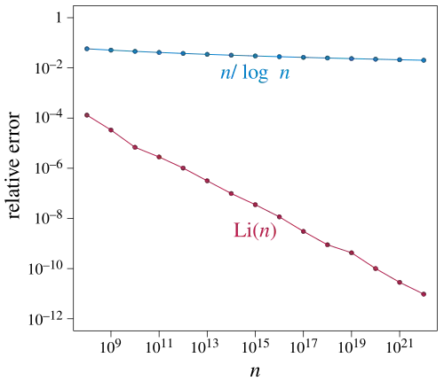 and means that the ratio of to the right-hand fraction approaches 1 as grows to infinity.[81] This implies that the likelihood that a randomly chosen number less than is prime is (approximately) inversely proportional to the number of digits in .[82] It also implies that the th prime number is proportional to [83] and therefore that the average size of a prime gap is proportional to .[68] A more accurate estimate for is given by the offset logarithmic integral[81]