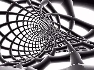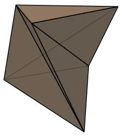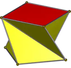 A twisted prism is a nonconvex polyhedron constructed from a uniform n-prism with each side face bisected on the square diagonal, by twisting the top, usually (but not necessarily) by π/n radians (180/n degrees). If the bisectors are slanted to the left, then twisting the top base in the right direction (looking at the top of the prism) by a small angle gives nonconvex polyhedron and twisting it in the left direction, a convex polyhedron (see twisted square prism on the image). If the bisectors are slanted to the right, then twisting the top base in the left direction gives nonconvex polyhedron, in the right direction, convex one (see twisted dodecagonal prism).[8][9]