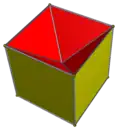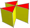 For example, {4}×{4}, a 4-4 duoprism is a lower symmetry form of a tesseract, as is {4,3}×{ }, a cubic prism. {4}×{4}×{ } (4-4 duoprism prism), {4,3}×{4} (cube-4 duoprism) and {4,3,3}×{ } (tesseractic prism) are lower symmetry forms of a 5-cube.