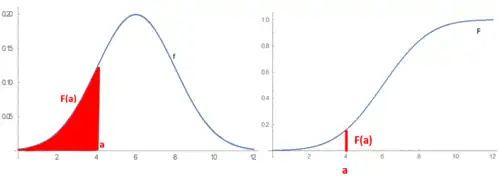 Figure 1: The left graph shows a probability density function. The right graph shows the cumulative distribution function. The value at a in the cumulative distribution equals the area under the probability density curve up to the point a.